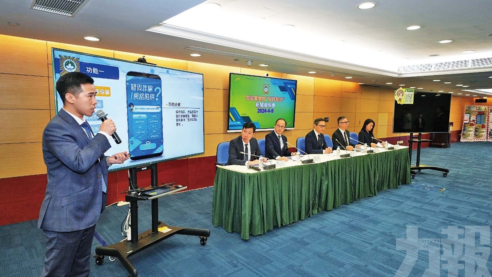 司警局昨(9)日於總部大樓舉行「反詐程式」新聞發佈會,由司警局局長薛仲明主持。他介紹, 反詐程式的功能包括四項:(一)詐騙搜尋器:輸入可疑來電號碼、電郵、銀行戶口等資料,獲取經系統比對分析後的詐騙風險評估結果。(二)詐騙線索上報:公眾可更便捷地向警方提供懷疑涉詐線索,協助警方預警和分析詐騙犯罪趨勢。(三)詐騙知多D:公眾可在同一頁面瀏覽所有電訊網絡騙案的手法、防騙技巧及警情通告等資訊。(四)騙案識別:公眾能以第一身角度體驗「公檢法」、 「猜猜我是誰」及「殺豬盤」等詐騙手法和套路,以及模擬進行「線上可疑匯款勸退」措施。