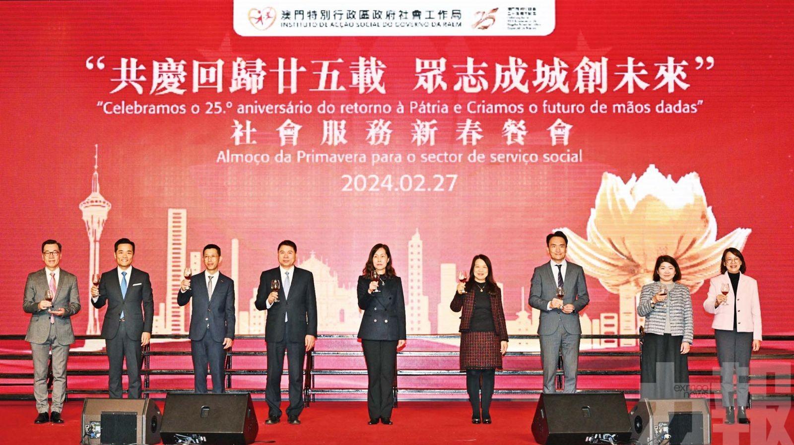 新春餐會昨午舉行,歐陽瑜致詞稱,今年是中華人民共和國成立75周年,亦是澳門回歸祖國25周年的雙慶之年。回歸25年來,特區政府一直把改善民生、關顧弱勢社群作為施政重點,並持續推行多重措施,讓本澳的社會服務事業得到長足發展。其中,對社服機構的資助金額,由回歸初期一億多元,增加至2023年逾16億元,增幅為15倍;各類社會服務的受惠人次,亦由回歸初期每年八萬多人次,增至去年逾520萬人次,增幅達64倍,未來會繼續協同社會服務界保障弱勢社群。歐陽瑜又指,為配合粵港澳大灣區、橫琴粵澳深度合作區的建設,特區政府亦已在「澳門新街坊」內設立家庭社區服務中心和長者服務中心,便利澳門居民在深合區生活。