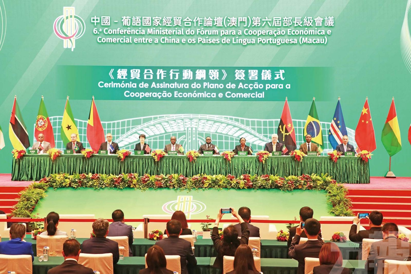 中國—葡語國家經貿合作論壇(澳門)第六屆部長級會議昨(22)日下午以閉門會議形式舉行,會議結束後中國與安哥拉、巴西、維德角、幾內亞比紹、赤道幾內亞、莫三比克、葡萄牙、聖多美和普林西比以及東帝汶簽署《經貿合作行動綱領》,明確了未來三年中國與葡語國家經貿合作的重點領域,並進一步發揮澳門作為中國與葡語國家商貿合作服務平台的作用。