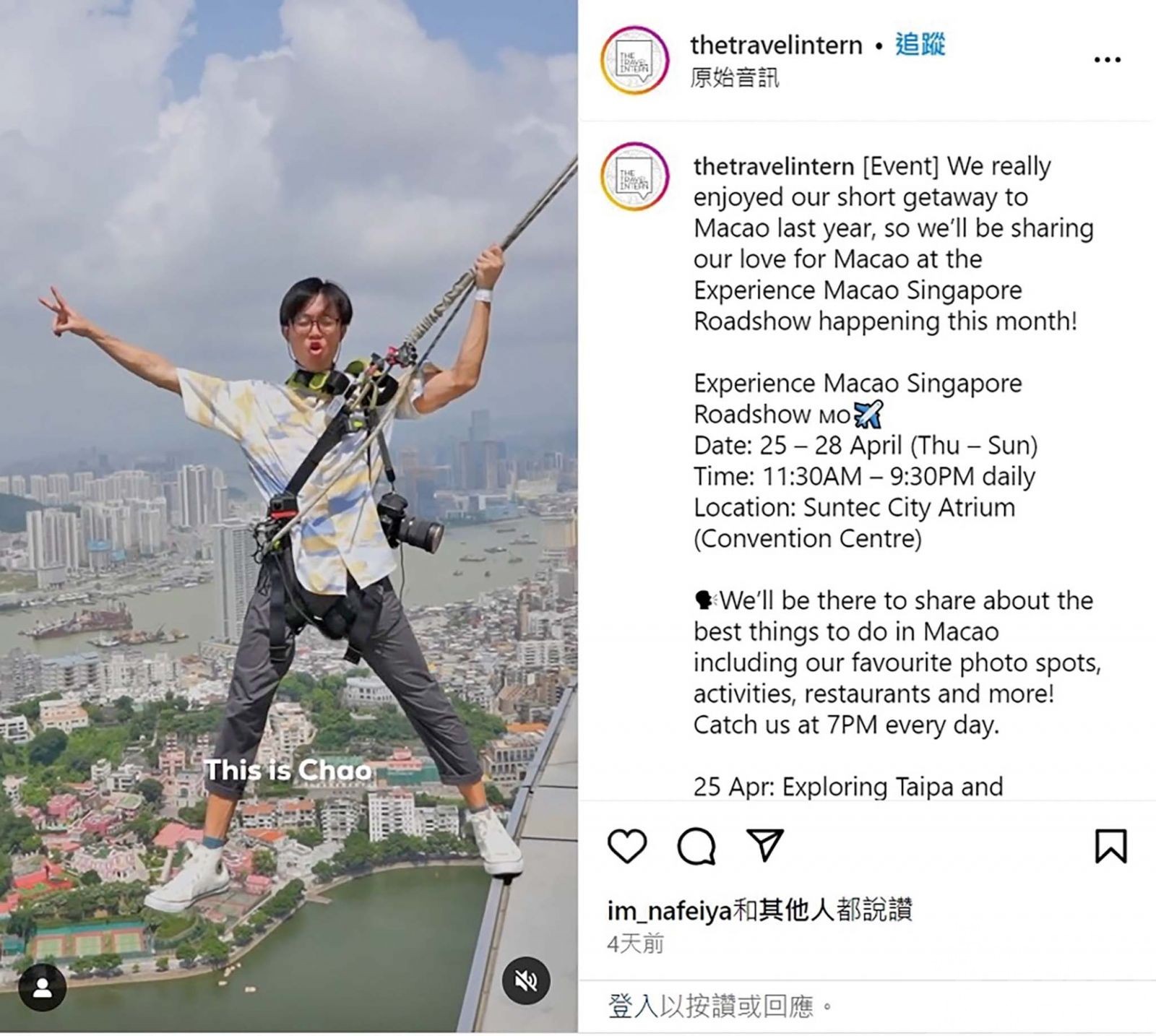 新加坡旅遊達人The Travel Intern在旗下平台宣傳活動。 (旅遊局圖片)