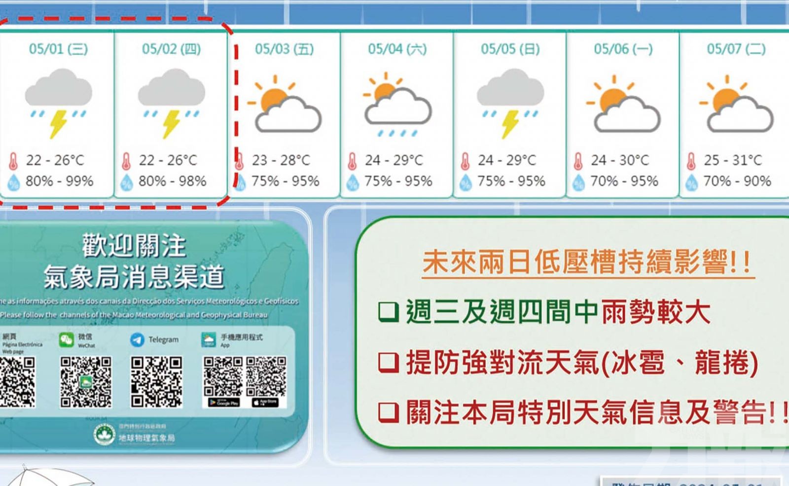 氣象局預料,低壓槽將持續於未來兩日影響本澳,珠三角地區天氣仍然不穩定,會有驟雨及雷暴。適逢勞動節假期,氣象局呼籲市民出門前要加倍留意天氣變化,並持續關注局方的特別天氣資訊及天氣警告。