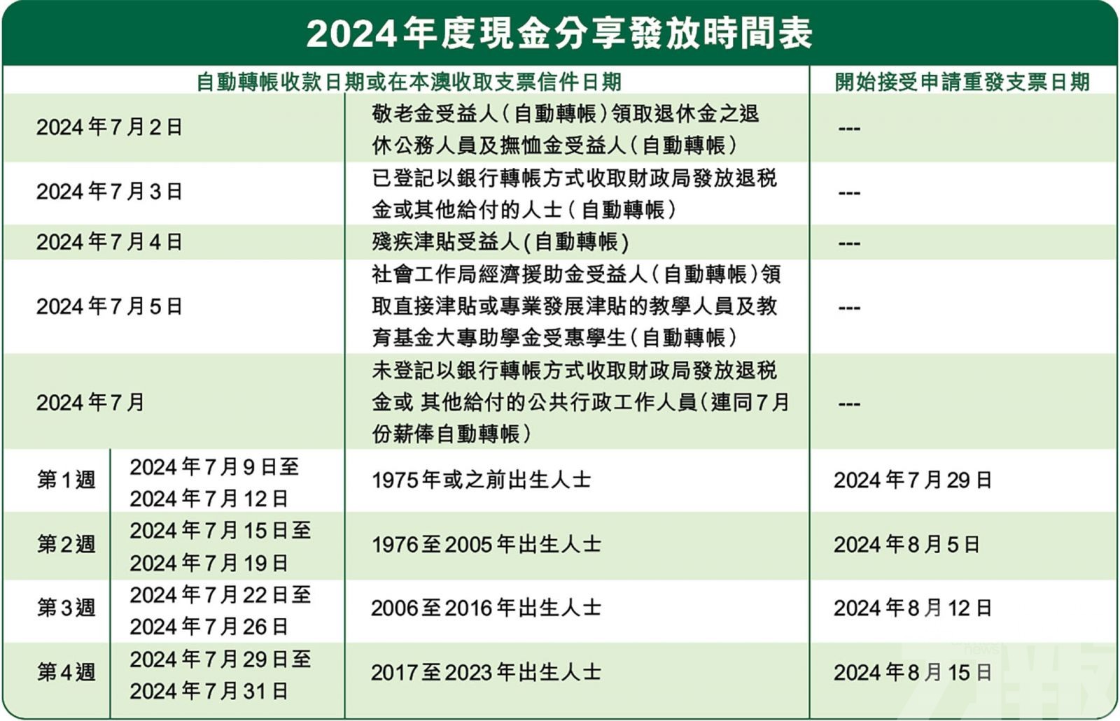本年度現金分享計劃的發放安排與去年相同,主要以銀行轉帳或郵寄劃線支票兩種方式向合資格居民發放款項,其中領取各項津貼、援助金、助學金及公職人員報酬,以及已選擇以銀行轉帳方式收取退稅金或其他給付的人士,現金分享款項將直接轉入其帳戶。至於其他合資格的居民,則會按出生年份的先後順序,在四周內向其郵寄劃線支票。