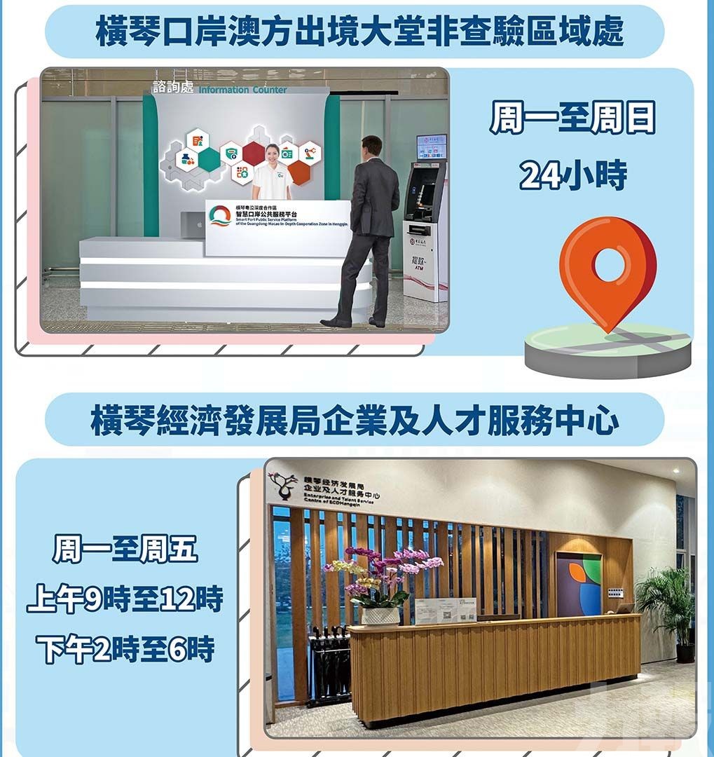 橫琴口岸出入境大堂澳門側及合作區經濟發展局企業和人才服務中心還設有線下咨詢處,提供公服平台的業務咨詢服務。(深合區經濟發展局圖片)
