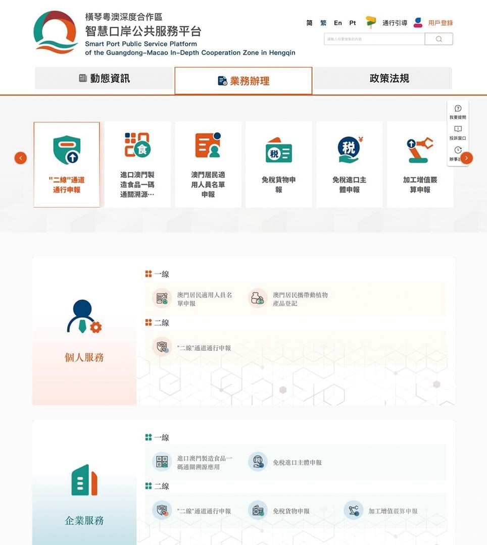 橫琴智慧口岸公共服務平台網站2月29日正式上線啓用,提供通關申報等多種便利服務。(深合區經濟發展局圖片)