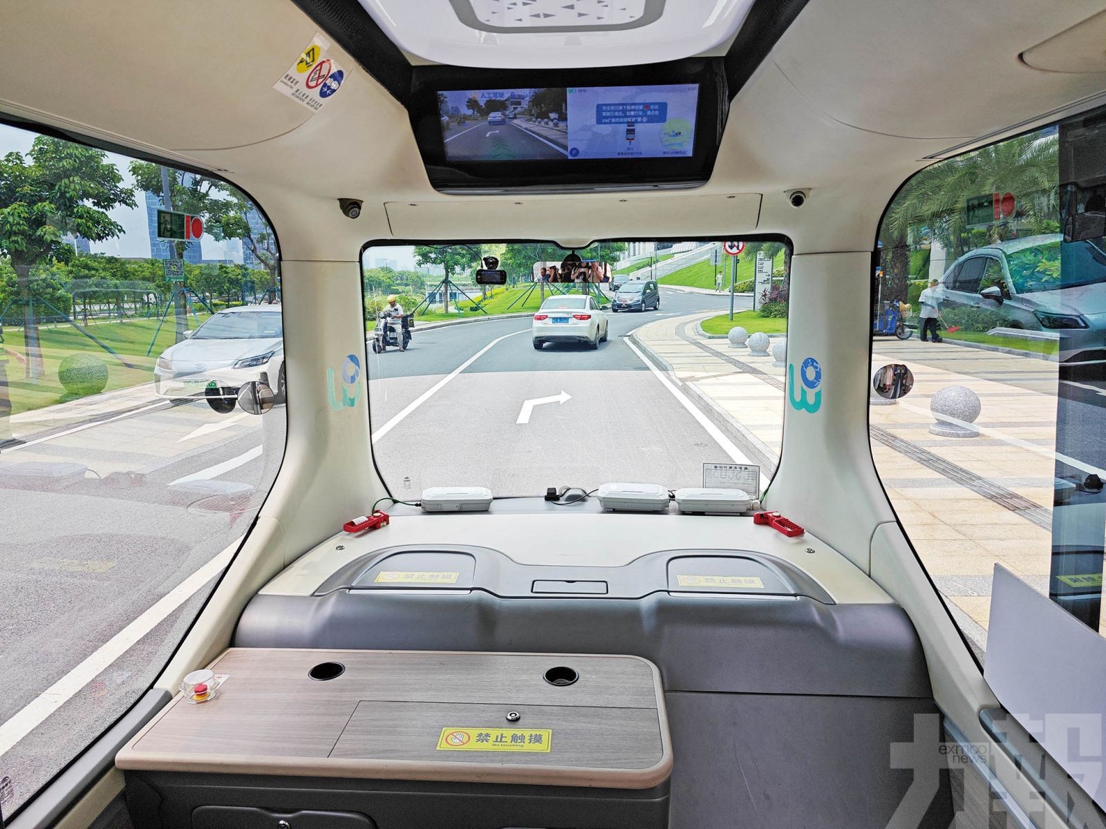 自動駕駛小巴正在橫琴開啟遠程高度自動駕駛道路測試,駕駛位無安全員、無方向盤。 (林嘉欣攝)