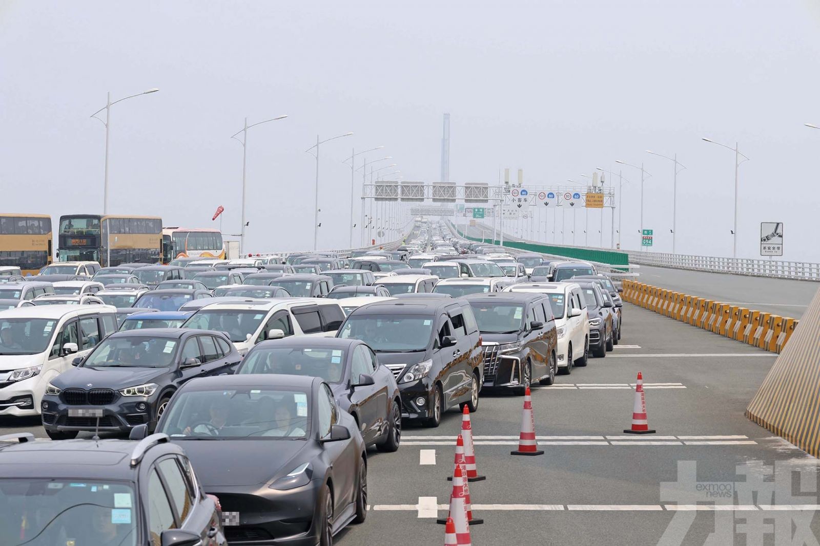 自「港車北上」「澳車北上」政策正式實施以來,港澳居民北上消費成風。每逢公眾假期,大橋上更是排起長長車龍。 (新華社圖片)