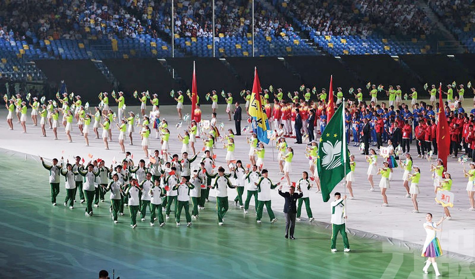 第十五屆全運會將於明(2025)年由粵港澳共同承辦。圖為2021年澳門體育代表團出席陝西西安亞運會開幕式。(新華社圖片)