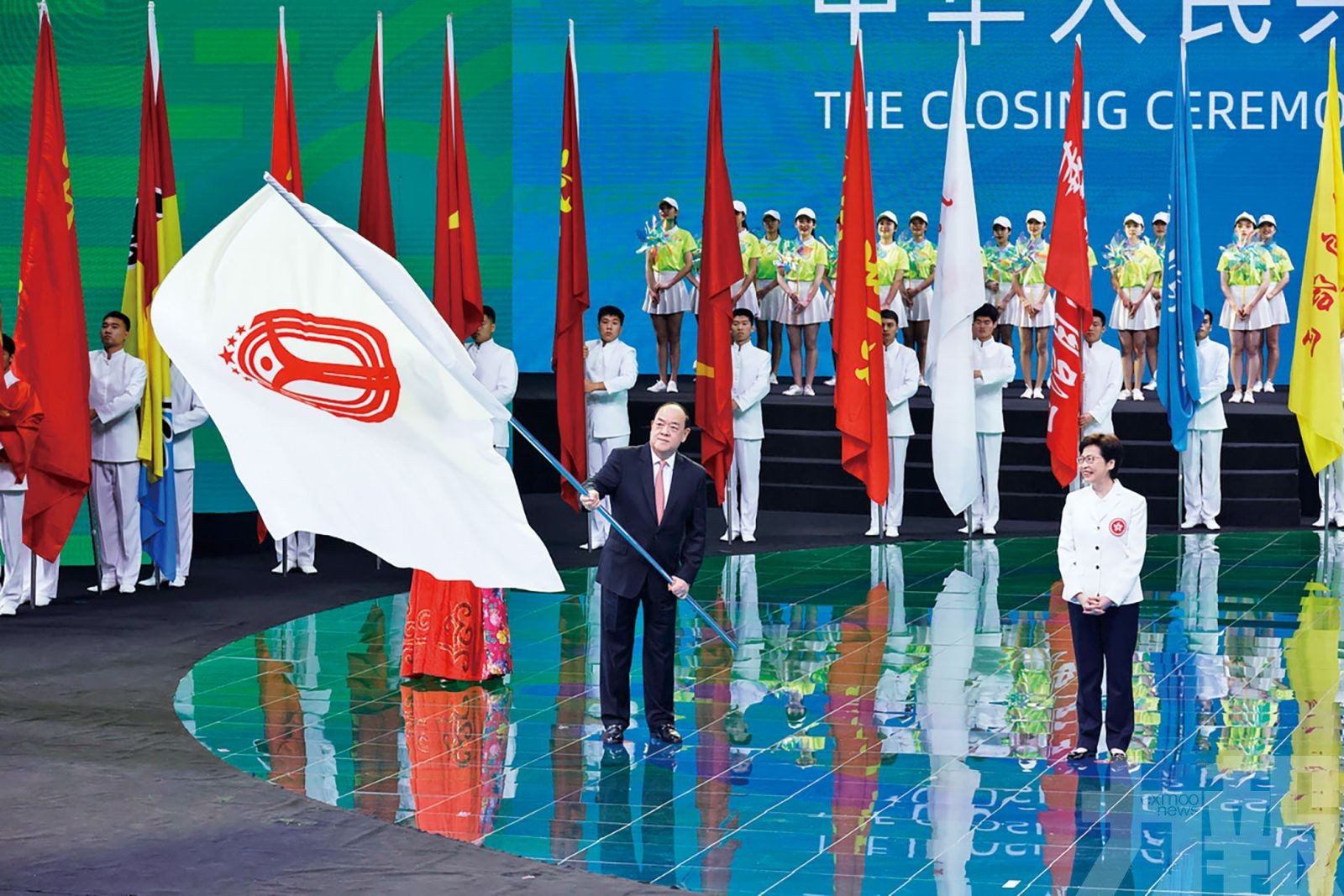 在第十四屆全國運動會開幕式上,行政長官賀一誠等粵港澳三地領導接過中華人民共和國運動會會旗,象徵2025年第十五屆全國運動會,由粵港澳三地共同承辯。(資料圖片)