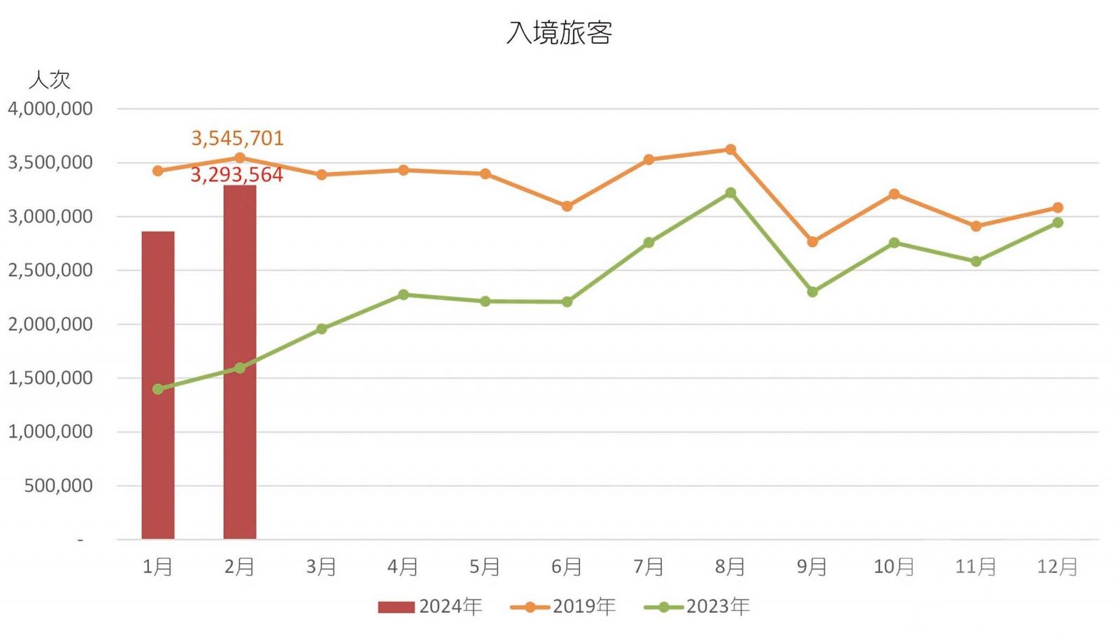 今年首兩月與2019年全年及2023年全年的入境旅客數字對比。(統計局圖片)