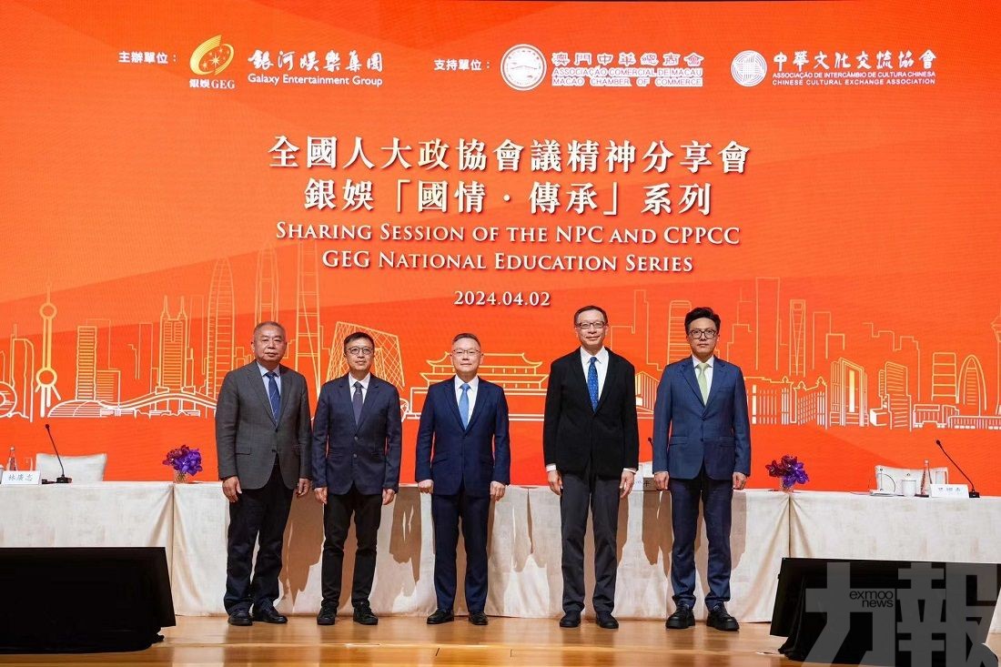 銀河娛樂集團(下稱「銀娛」) 背靠祖國、植根澳門,多年來積極透過多元舉措向團隊成員、本澳青少年及社區提倡 學習國情及區情之重要性。適逢今年為中華人民共和國成立75周年及澳門特別行政區 成立25周年,銀娛在澳門中華總商會與中華文化交流協會的支持下,昨(3)日於銀河國際 會議中心之銀河演講廳連續第5年舉辦「全國人大政協會議精神分享會 — 銀娛『國 情‧傳承』系列」。活動邀請到全國人大代表、中華文化交流協會理事長崔世平先 生;全國政協委員、澳門中華總商會理事長馬志毅先生;以及全國政協委員、銀娛副 主席呂耀東先生作主講嘉賓,透過結合線上及線下形式,向合共約600名來自不同地 區的銀娛管理層成員,以及中華文化交流協會與澳門科技大學代表,傳達意義重大的 「兩會」精神及分享個人深切體會。