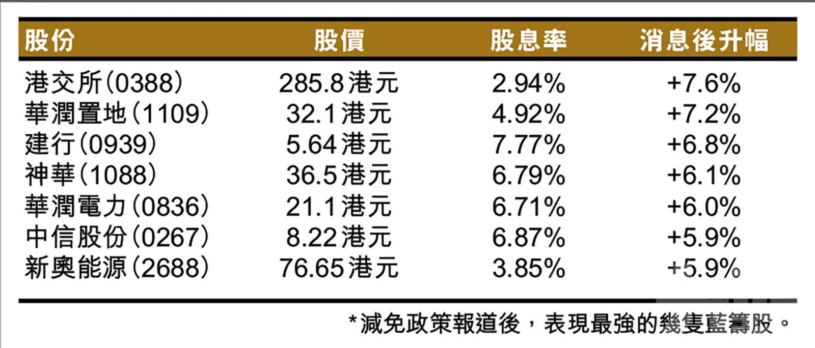 除了港交所以外,高息股亦屬於免稅政策的受惠者,而且內銀股更屬當中代表。里昂預期,若有關政策落實,A/H之間的股息率差距將會收窄,而高息率高的國有內銀股料最為受惠;當中,看好股息率差距較大的建行(0939)及工行(1398)。