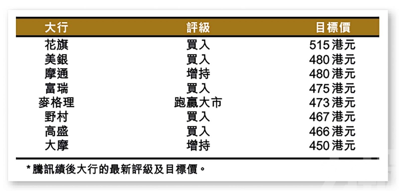 摩通則表示,騰訊首季業績正面,內地遊戲收入改善,而且廣告收入增長強勁;該行指出,公司在去年同期高基數之下,今年首季遊戲收入仍大致持平,預期在新遊戲推出的帶動下,次季遊戲收入將恢復增長。該行考慮到騰訊業績,以及股東未來的資本回報前景,重申仍然看好該股。