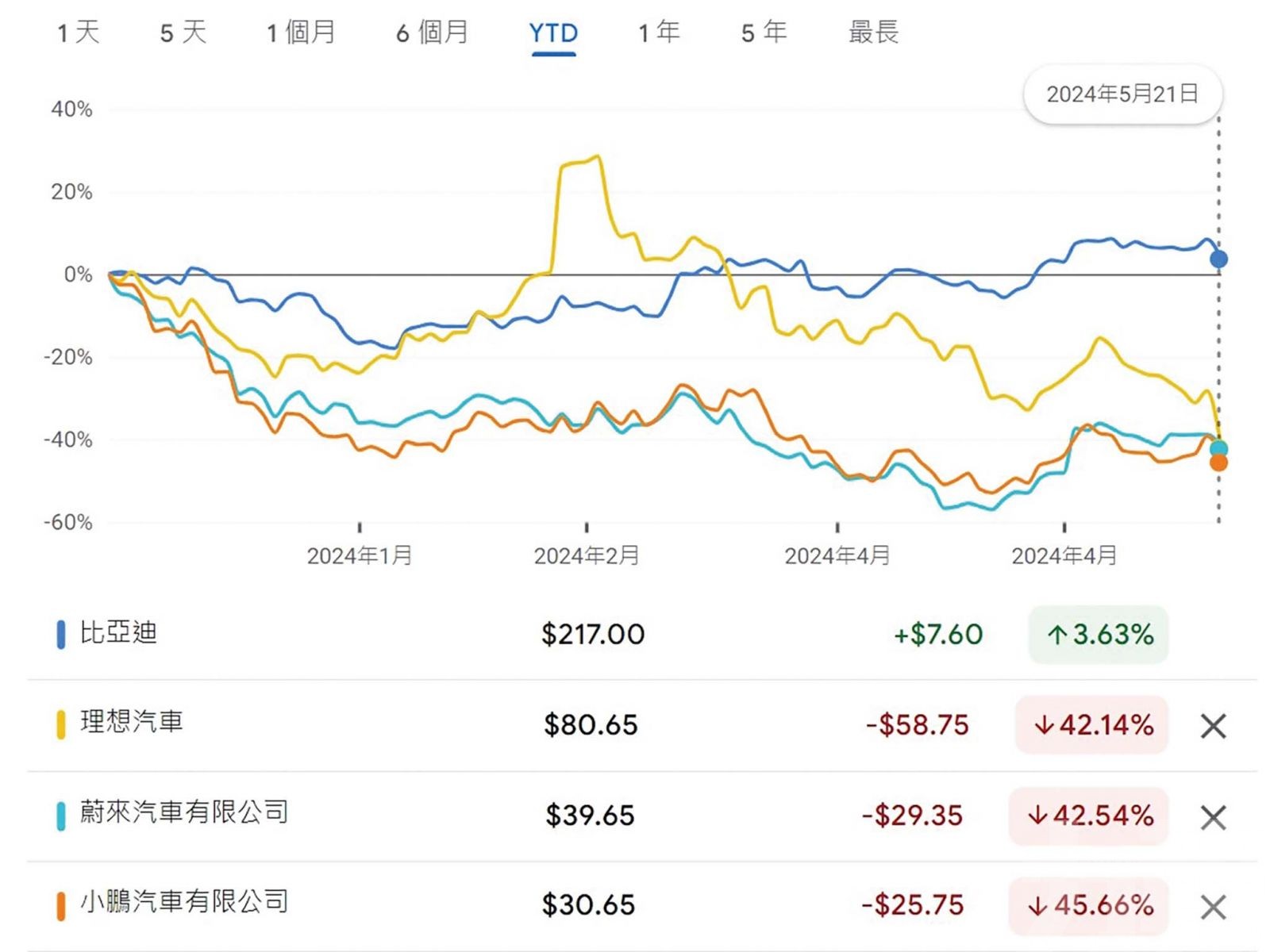 理想年初表現突出但後市大幅回調,今年累計跌幅已與兩間同業相近。 (資料來源:谷歌財經)