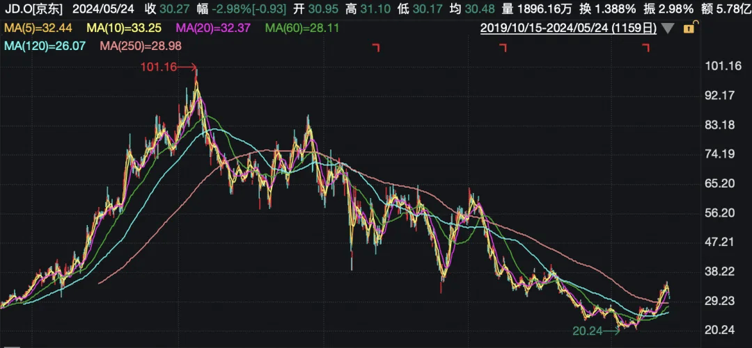 截至5月24日美股收盘,京东股价为每股30.27美元,总市值为481.8亿美元,而在2021年京东股价最高达101美元(前复权),相比之下股价较高位跌幅达70%。