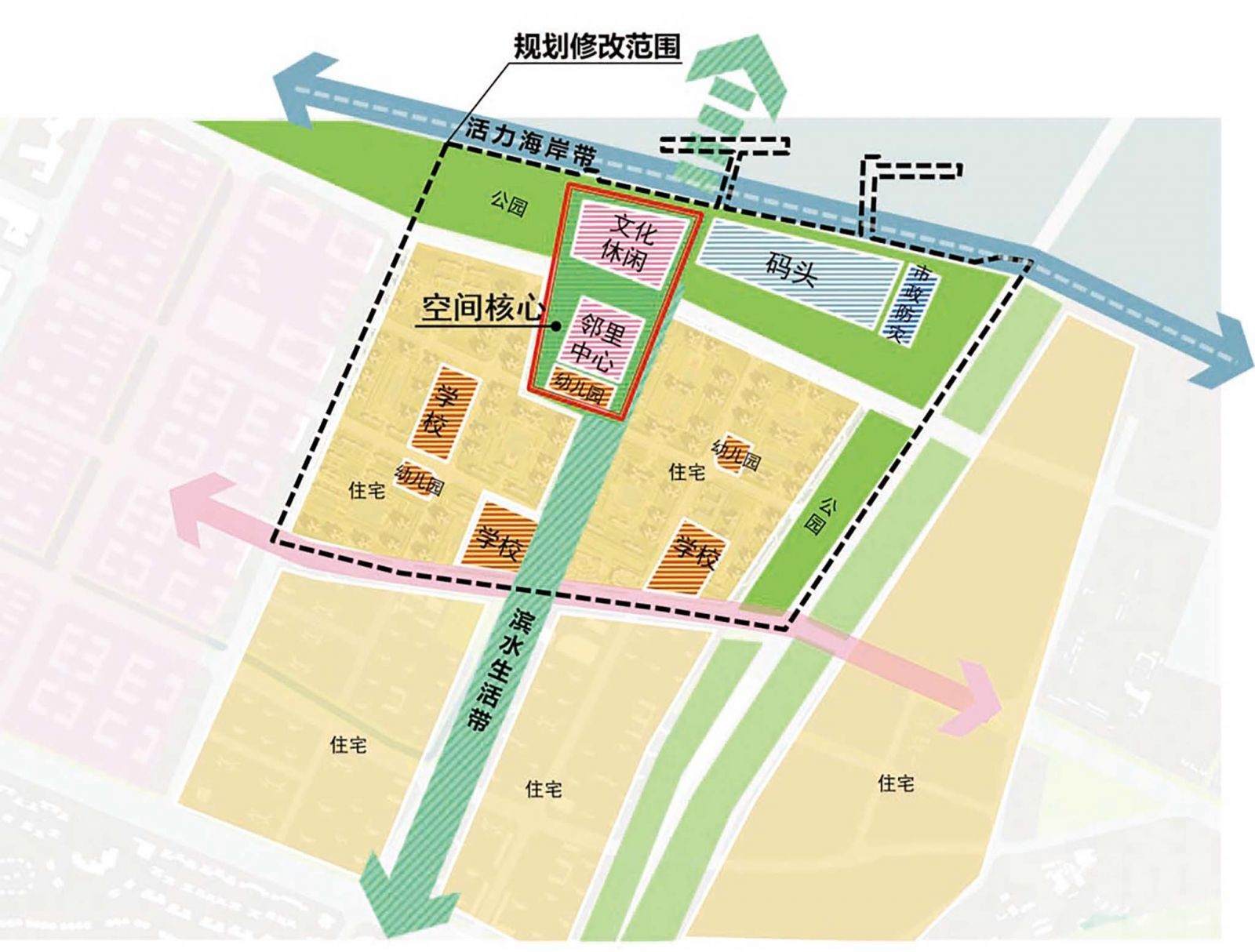 根據規劃,該片區呈現兩帶+1空間核心的格局。活力海岸帶沿海邊延伸,規劃有公園綠地、遊艇碼頭等設施;濱水生活帶縱向延伸,穿過片區住宅區,連通包含文化休閒、鄰里中心的空間核心。