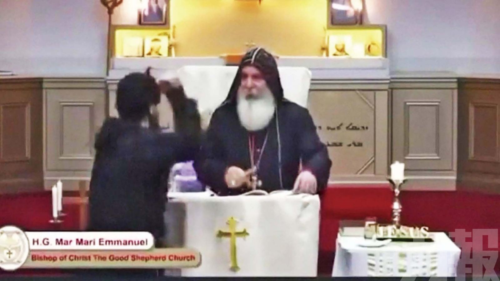 直播畫面可見,男子衝向講台,用刀刺向正在講道的主教。 (網絡圖片)