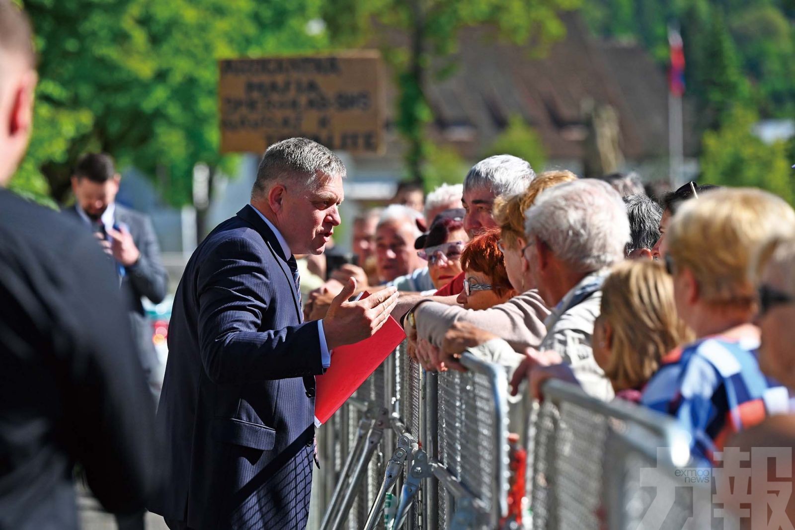斯洛伐克總理菲佐與支持者握手時,遭槍手襲擊。 (美聯社圖片)