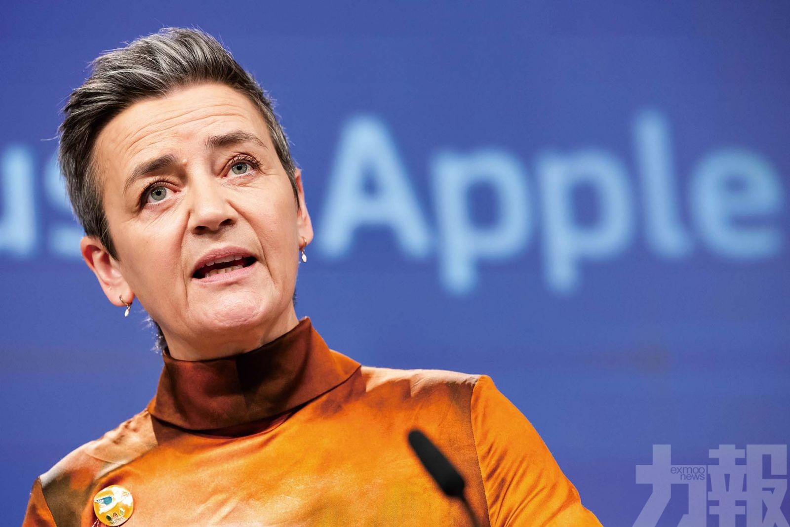 Margrethe Vestager在記者會上說明對蘋果的處罰。(美聯社圖片)