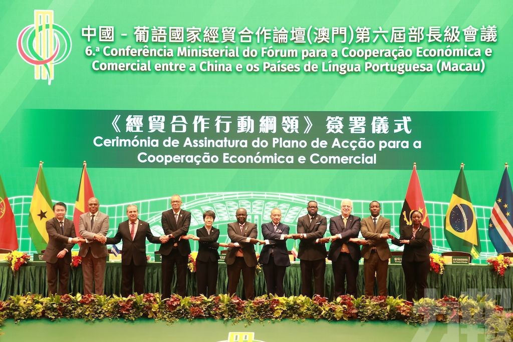 中國—葡語國家經貿合作論壇(澳門)第六屆部長級會議今(22)日下午以閉門會議形式舉行,會議結束後中國與安哥拉、巴西、佛得角、幾內亞比紹、赤道幾內亞、莫桑比克、葡萄牙、聖多美和普林西比以及東帝汶簽署《經貿合作行動綱領》。