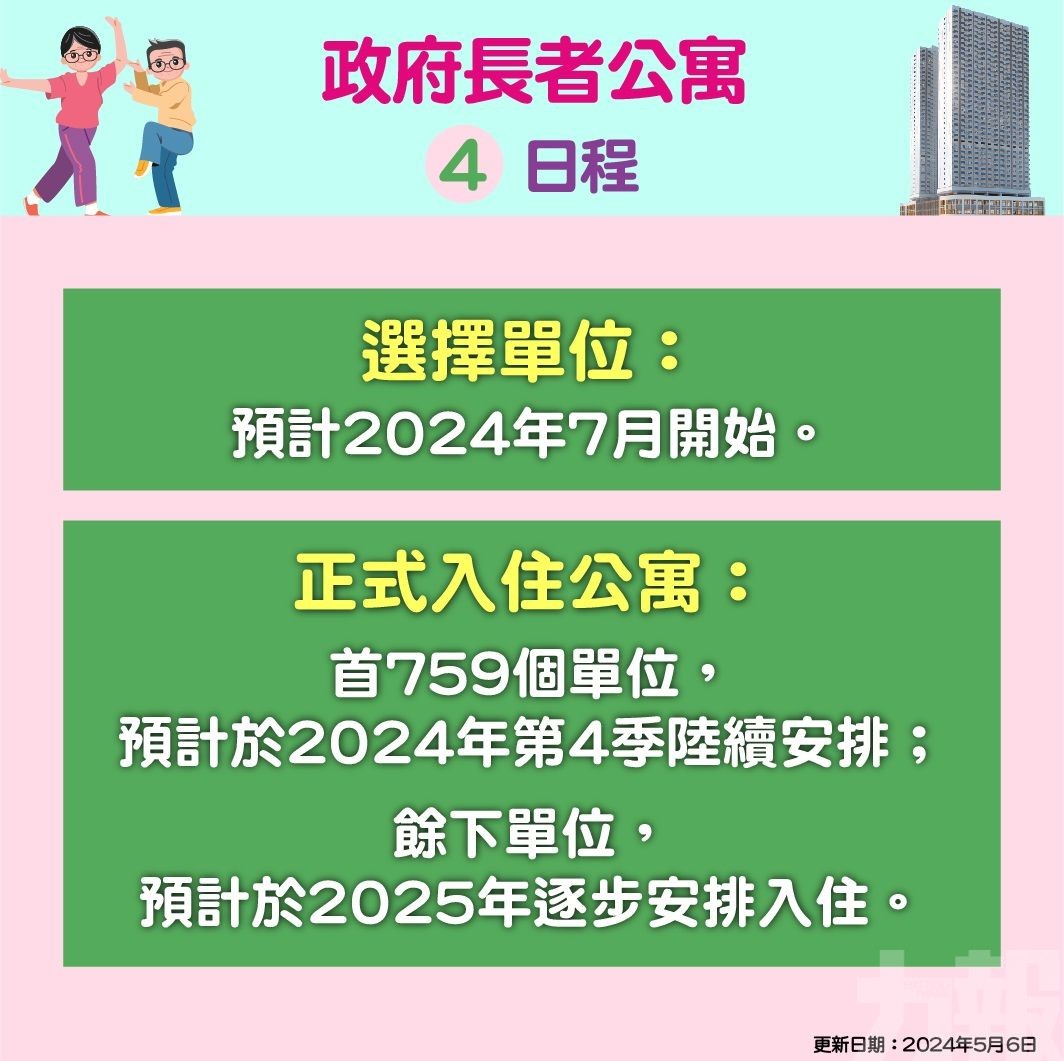澳門特別行政區公報刊登第31/2024號社會文化司司長批示,公佈政府長者公寓的住宿單位使用費表、享有優惠價格的條件及1,518個住宿單位分佈等詳情。