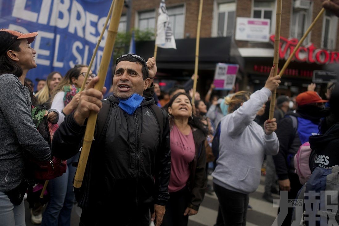 當地時間8日,反政府示威者手持標語高喊米萊下台。(美聯社圖片)
