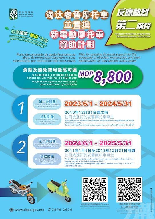 兩項資助計劃的第二申請期將於下月1日起開始,《淘汰老舊摩托車並置換新電動摩托車資助計劃》的資助對象為2011年1月1日至2013年12月31日期間註冊或登記的老舊電單車車主,但不包括於2023年5月22日或之後重新註冊的老舊電單車。《淘汰老舊柴油車資助計劃》的資助對象為2009年1月1日至2013年12月31日期間註冊及登記的老舊柴油車車主,但不包括於2023年5月22日或之後重新註冊的老舊柴油車。