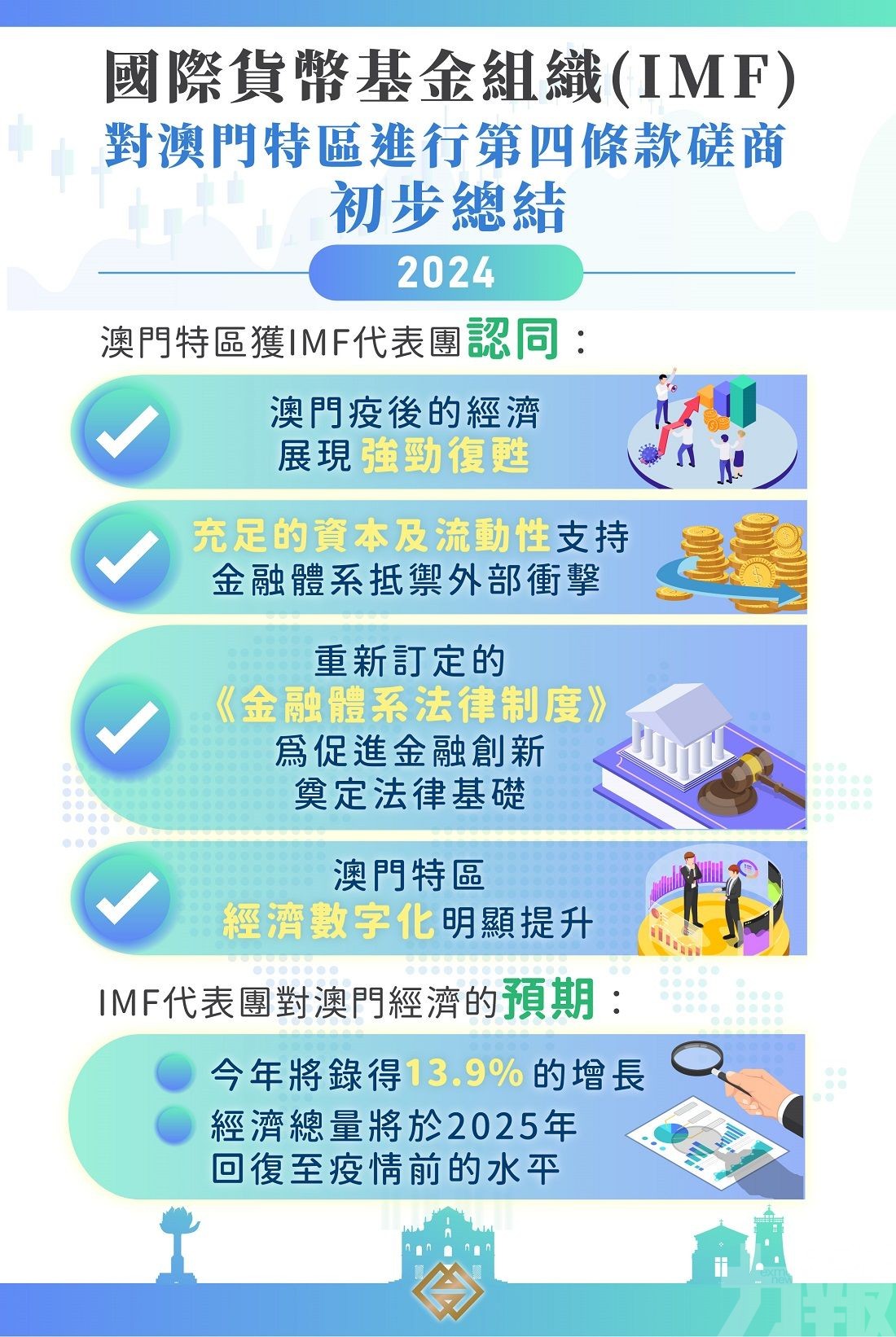 在《2024年第四條款磋商代表團工作人員總結聲明》中,IMF專家指出隨着澳門與世界各地全面恢復往來,經濟展現強勁復甦,並預期澳門經濟今年將錄得13.9%的增長,而經濟總量將於2025年回復至疫情前的水平。同時,充足的資本及流動性將支持澳門金融體系抵禦外部衝擊的能力。