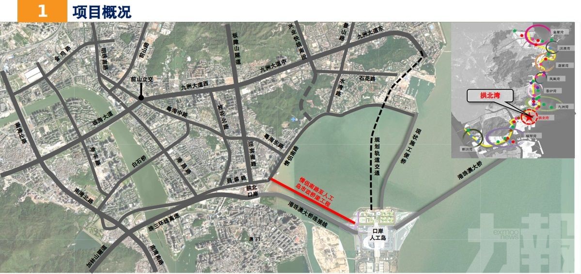 該項目位於珠海市香洲區拱北灣內,是港珠澳大橋珠海公路口岸人工島與拱北片區交通和市政管線聯通的重要基礎設施。項目起于昌盛路與情侶南路交叉口,與港珠澳大橋連接線平行,以橋樑方式跨越拱北灣,終點以平交形式接至港珠澳大橋人工島北珠一路(原北五路),全長約2.22千米,橋樑全長約2.06千米。道路等級為城市次乾路,橫斷面採用雙向4車道+單側人行道佈置,設計車速40千米/小時,標準段橋樑寬度24.8米。