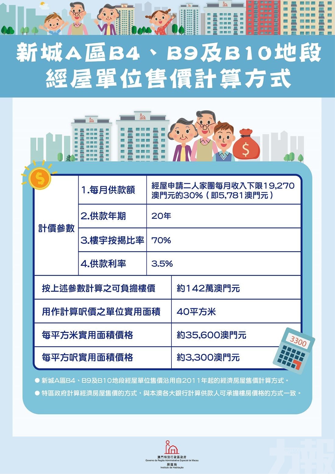 具體計算方式是以現時經濟房屋申請二人家團的每月收入下限19,270澳門元的30%作為每月供款負擔,按供款期20年、供款利率3.5%,以及貸款額為樓價7成,計算出可負擔之樓價為1,423,991澳門元。再以購入一個實用面積為40平方米之單位,換算出每平方呎實用面積呎價約3,300澳門元。根據此基準呎價,每個單位的具體售價將視乎單位座向、樓層、位置、面積和類型而上、下調整。