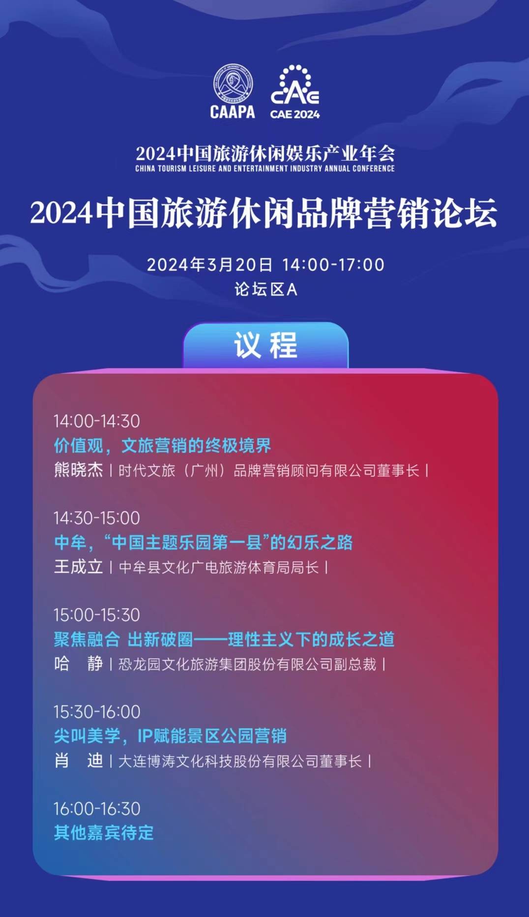 随着文旅产业的高质量发展,文旅消费场所如何在满足游客不断增长的旅游休闲需求的同时,提升自己的品牌影响力与价值,成为当下面临的一大挑战。在2024中国旅游休闲品牌营销论坛上,来自时代文旅(广州)品牌营销顾问有限公司董事长熊晓杰、河南省郑州市中牟县文化广电旅游体育局局长王成立、恐龙园文化旅游集团股份有限公司副总裁哈静、大连博涛文化科技股份有限公司董事长肖迪等嘉宾将进行不同主题的演讲,分享他们对品牌营销的理解与看法、经验与做法,带来他们对行业的观察与解读。