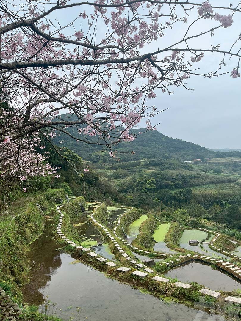 新北石門絕美秘境步道「嵩山百年梯田步道」,台灣唯一火山岩石砌梯田,穿梭在田埂之間景色超美。