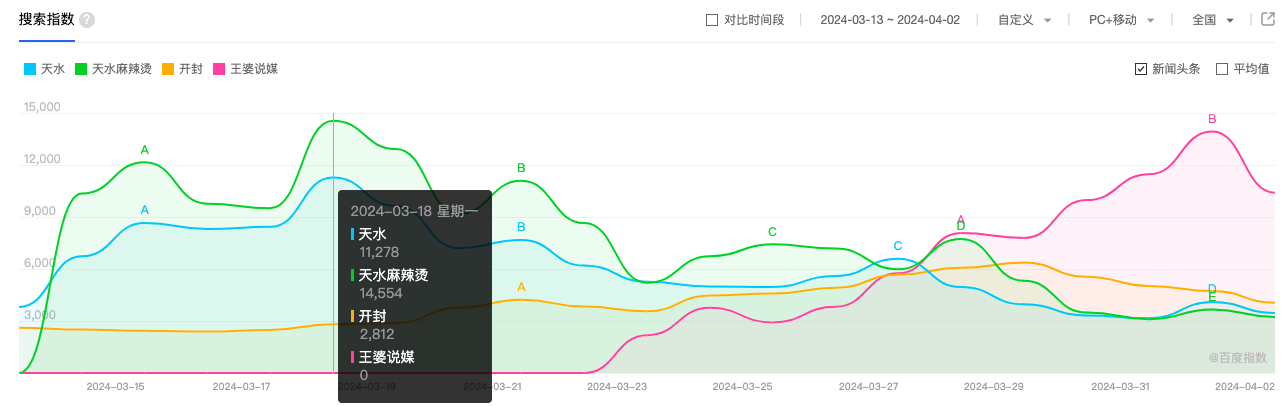 百度指数显示,从2024年3月13日开始,天水麻辣烫的百度搜索指数和资讯指数开始上升,3月18日,天水麻辣烫搜索指数达到峰值,为14554,随后搜索及资讯指数均开始下降,到3月30日搜索指数已经跌落至3492。