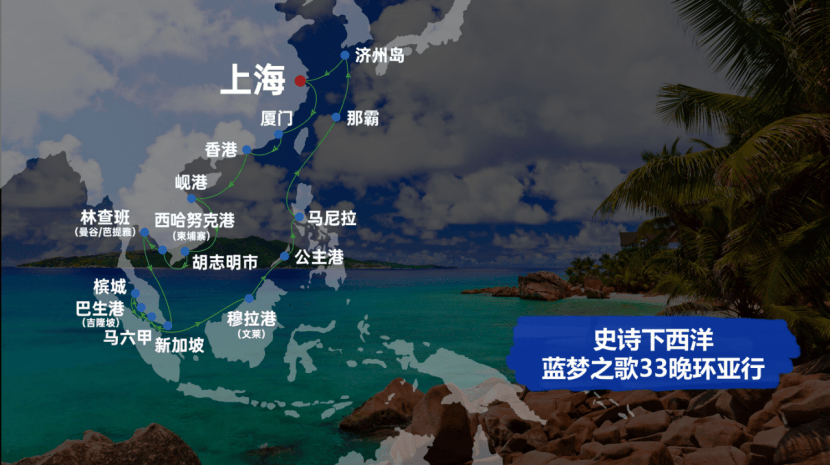 跟随“蓝梦之歌”上海启航一路南下,游客可以在沿海地标城市与浓郁热带小岛间无缝切换,感受南洋强大而热烈的文化生命力与包容力。带游客一路发掘更多惊喜,依次领略厦门的闽南风土、香港的多元动感,岘港的文化遗产、胡志明市的西贡文化、西哈努克港的炫目白沙、曼谷的包罗万象、芭提雅的浪漫海滩、槟城的小镇漫游、吉隆坡的人文经典、马六甲的古城印记、新加坡的融合生机、文莱的热带风情、巴拉望的“海上乌托邦”,马尼拉的岛国情调、那霸的琉球文化、济州的韩式风情。在邮轮出行3.0时代,躲避纷扰人群,独辟蹊径,“蓝梦之歌”带领游客遁入小而美的旅行目的地,体会悦游旅行新态度。