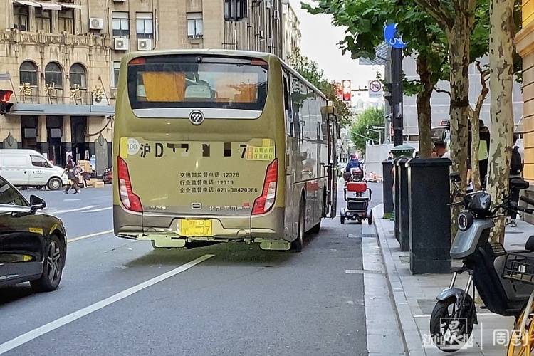 走到黄浦区政务服务中心门口,一名身材微胖的穿红T恤的妇女正低头玩手机。我们一行人再次被转手。红T恤妇女到马路对面,从一辆牌号为F256xxx的电瓶车上拿出一杯茶,再带着一行人沿江西中路往南走,走到福州路口,远远望见一辆车牌号为沪Dxxx07的黄灰色大客车停在路边。
