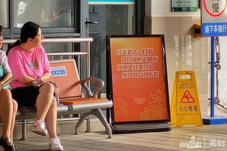 ▲标语牌写着“打击非法一日游,拒绝黑社黑导游”
