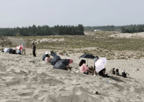 除了打卡拍照,绝大部分游客都是冲着 “沙疗”而来,大家“逐热而来”,纷纷在沙丘上撑起遮阳伞、戴着墨镜,或闭目养神,或轻声交流,享受着沙疗带给身体的酣畅淋漓。“沙疗”被誉为“露天桑拿”,主要通过将人身体的部分或全部埋入沙中,利用天然沙粒的温热、矿物质渗透、滋润性增加血液循环、舒缓疲劳,无论是长期劳作导致的肌肉劳损,还是各类关节疾病带来的疼痛,沙疗都能发挥其独特功效,深受广大游客喜爱。
