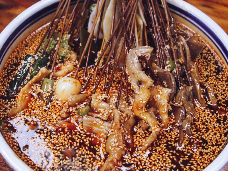 钵钵鸡,是乐山乃至整个四川地区都非常流行的一种小吃。它选用鸡肉、鸡杂等食材,切成薄片或小块,用竹签串起,然后浸泡在特制的红油或藤椒油中。据鸡毛店了解,这些调料由多种香料和辣椒精心调制而成,麻辣鲜香,让人一尝难忘。钵钵鸡不仅味道独特,而且价格亲民,是街头巷尾常见的美食之一。