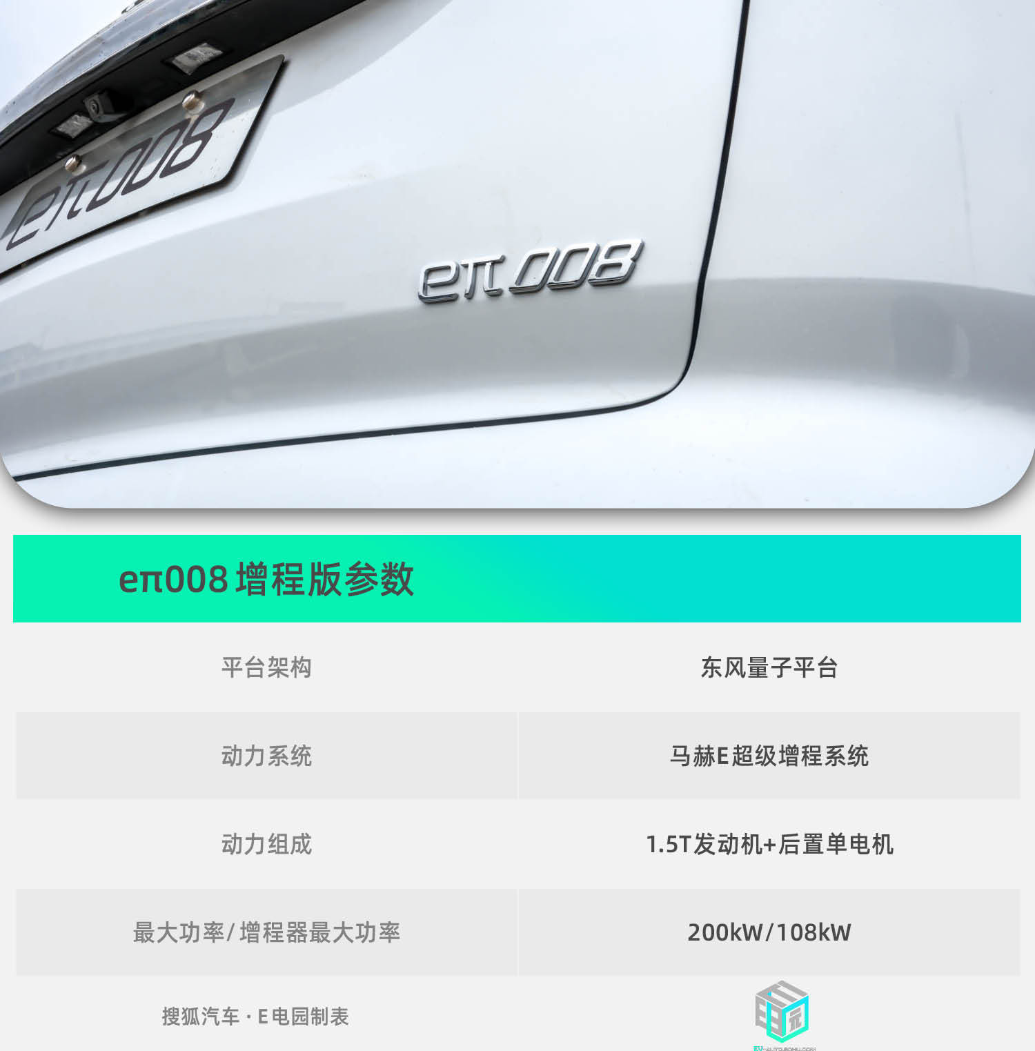 新车共配备纯电、增程两个版本车型,本次试驾车型为增程版。奕派eπ008基于东风量子架构打造,增程版和纯电版都搭载后置单电机,最大功率200kW。增程版搭载马赫E超级增程系统,采用1.5T发动机作为增程器,增程器功率108kW。纯电版本CLTC综合续航里程为636km,增程版本CLTC纯电续航里程为210km,综合续航里程超过1300km。