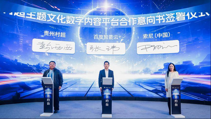 贵州村超品牌管理有限公司董事长、榕江县人民政府教育总顾问彭西西、百度智能云泛科技业务部总经理张玮、索尼(中国)有限公司消费电子与专业系统本部副总裁彭筱珊代表三方签署协议。