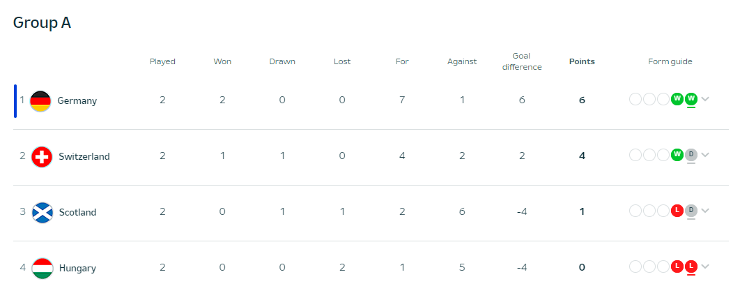 A组第2轮战罢,德国队两战全胜积6分,提前小组出线。瑞士队1胜1平积4分排名第二,苏格兰队1平1负积1分排名第三,匈牙利队两战皆负排名垫底。末轮比赛,瑞士队将对阵德国队,打平即可锁定前二,进而直接出线。苏格兰队和匈牙利队则将直接对话,取胜的球队还可保留出线希望。