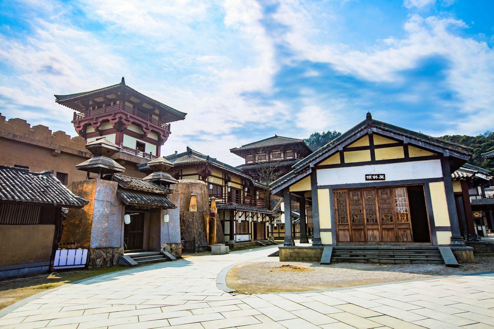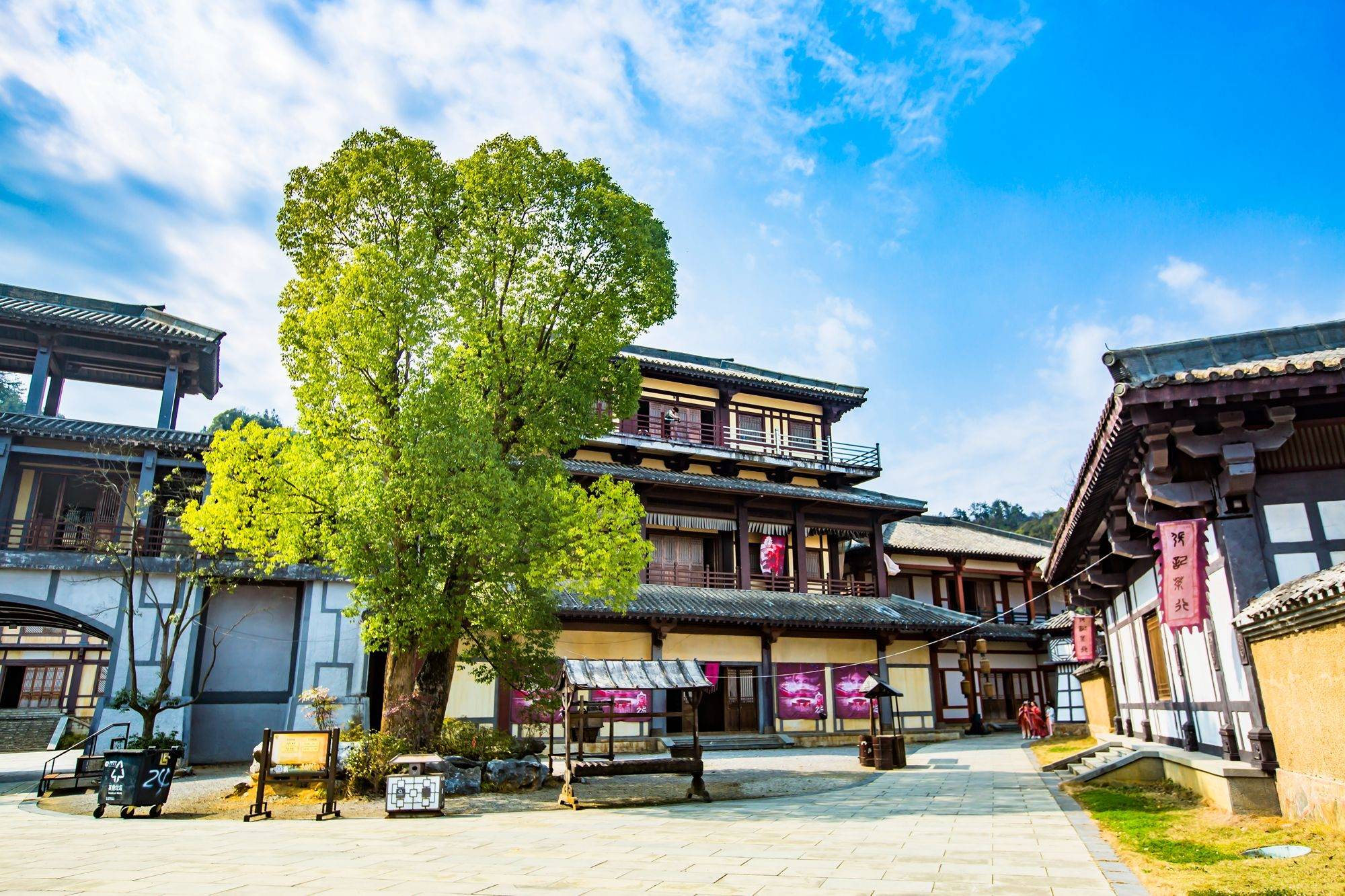 青石砖铺就的路上,街巷四通八达,客栈、酒肆、乐坊鳞次栉比、高低错落,古朴典雅的建筑做背景,营造出古风氛围,随便定格一处拍出的都是极有意境的古装大片。