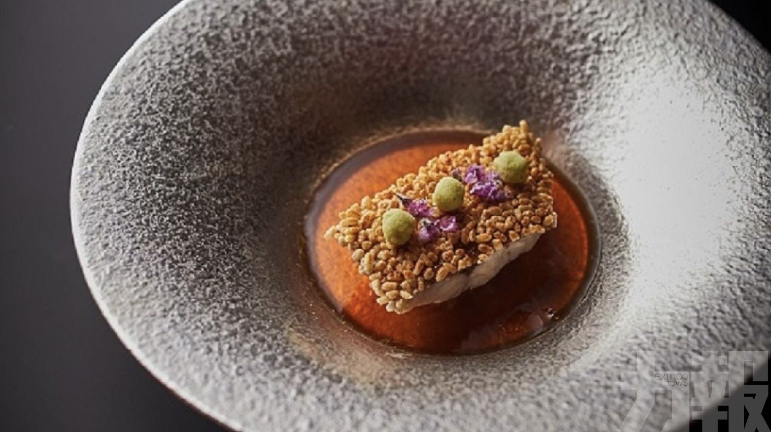 燒的赤鯥魚外面裹著香口米脆,紫色的紫蘇花及碧綠的芥末加以點綴,整道菜色彩多樣及口感豐富,是視覺和味覺的享受。