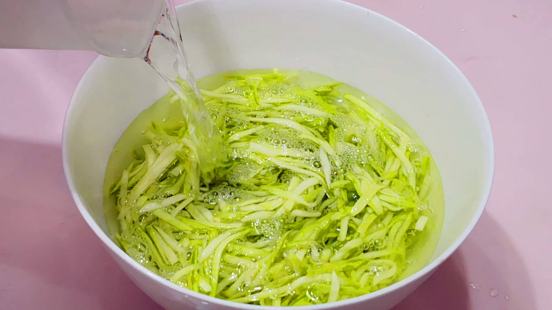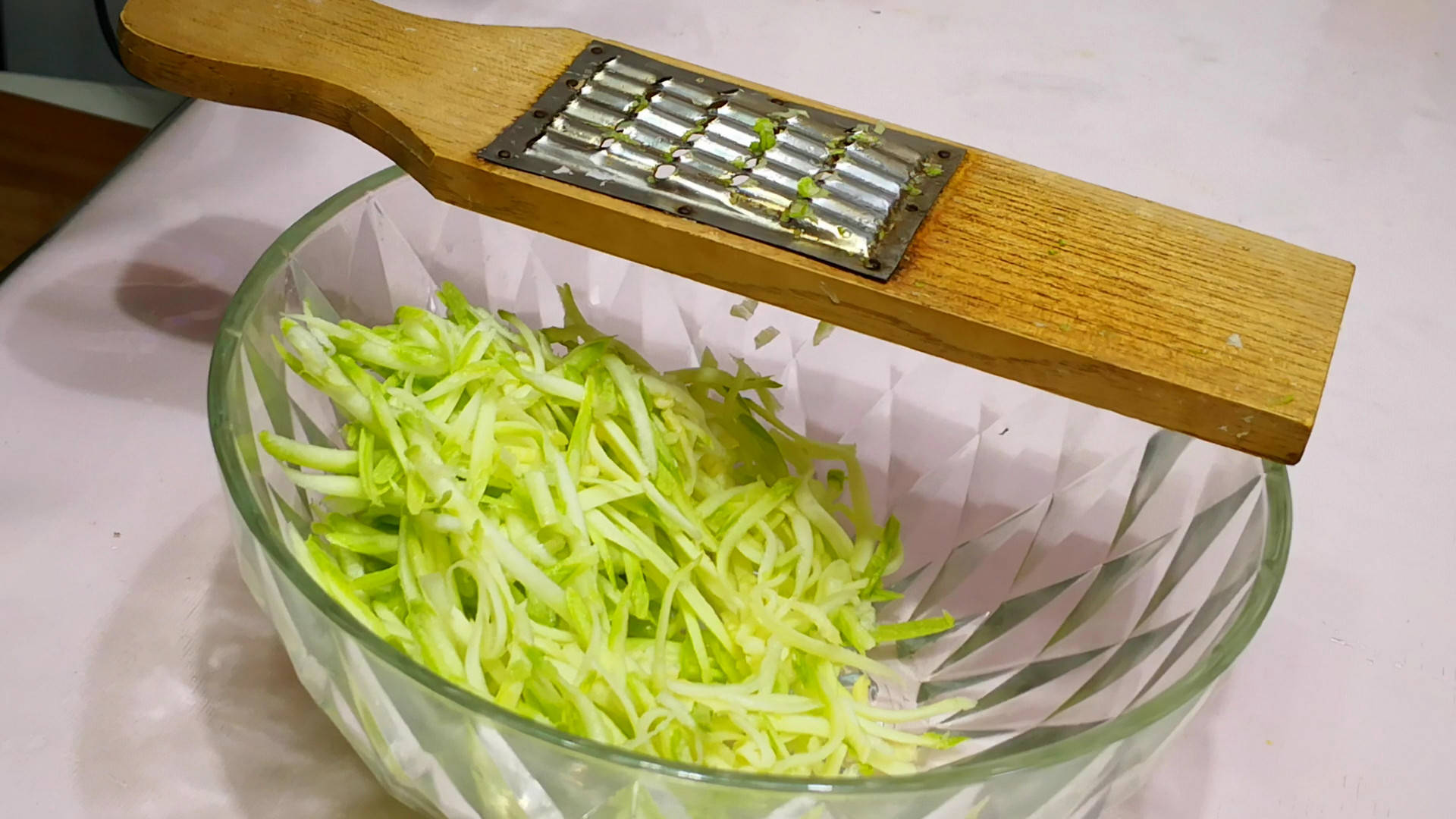 1.先把西葫芦清洗干净,然后竖着从中间切开,去掉中间的瓜瓤,用擦菜板擦成细丝。擦成丝后的西葫芦放入大碗中,然后加入一匙食盐,下手抓拌一会儿,让盐充分化开后,再放一边腌制十分钟以上,刹出西葫芦中的水分,这样再包饺子的时候就不会出水了。