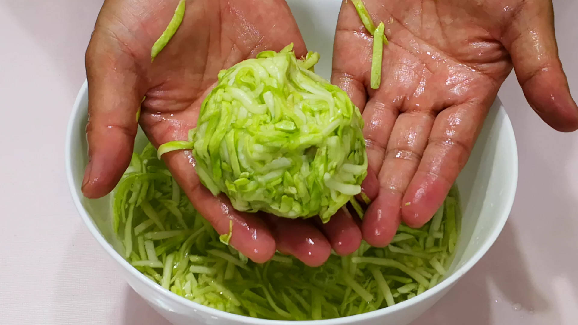 2.十几分钟后我们可以看到西葫芦已经刹出了很多的水分,这时我们用清水把它多冲洗几遍,冲去多余的盐水,以免包好饺子后太咸。然后挤干水分后将其剁细,放入碗中备用。