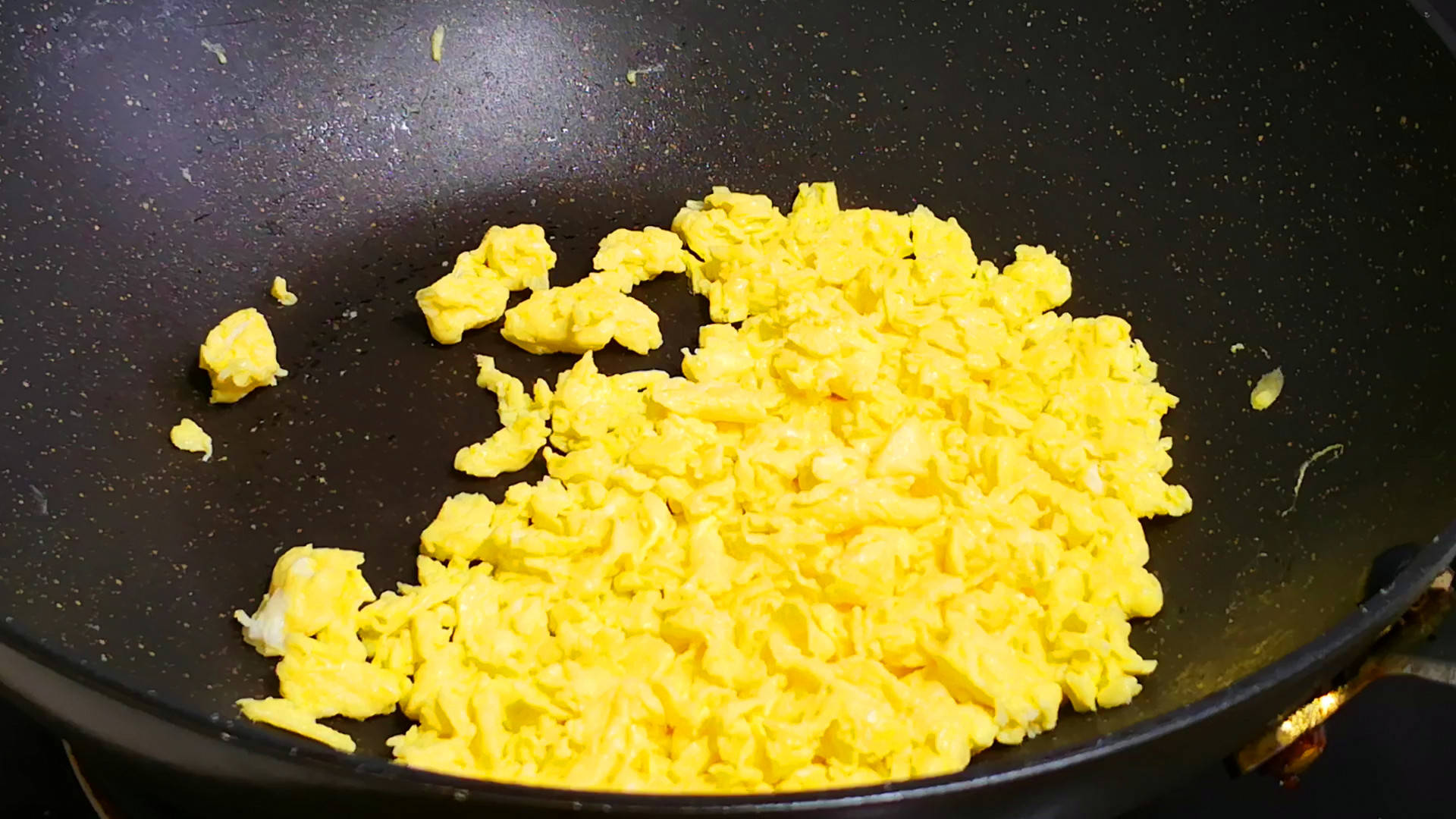 4.然后再取3鸡蛋打入碗内,少加一点点盐和料酒,顺着一个方向打散,再起锅加油,倒入蛋液,把它煎成大小均匀的鸡蛋碎后关火,盛出备用。