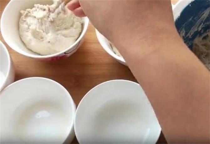 3.接下来准备4到5个碗,在碗里面刷上一层油,防止粘连,把搅拌均匀的面糊利用勺子和筷子放在每个碗中。