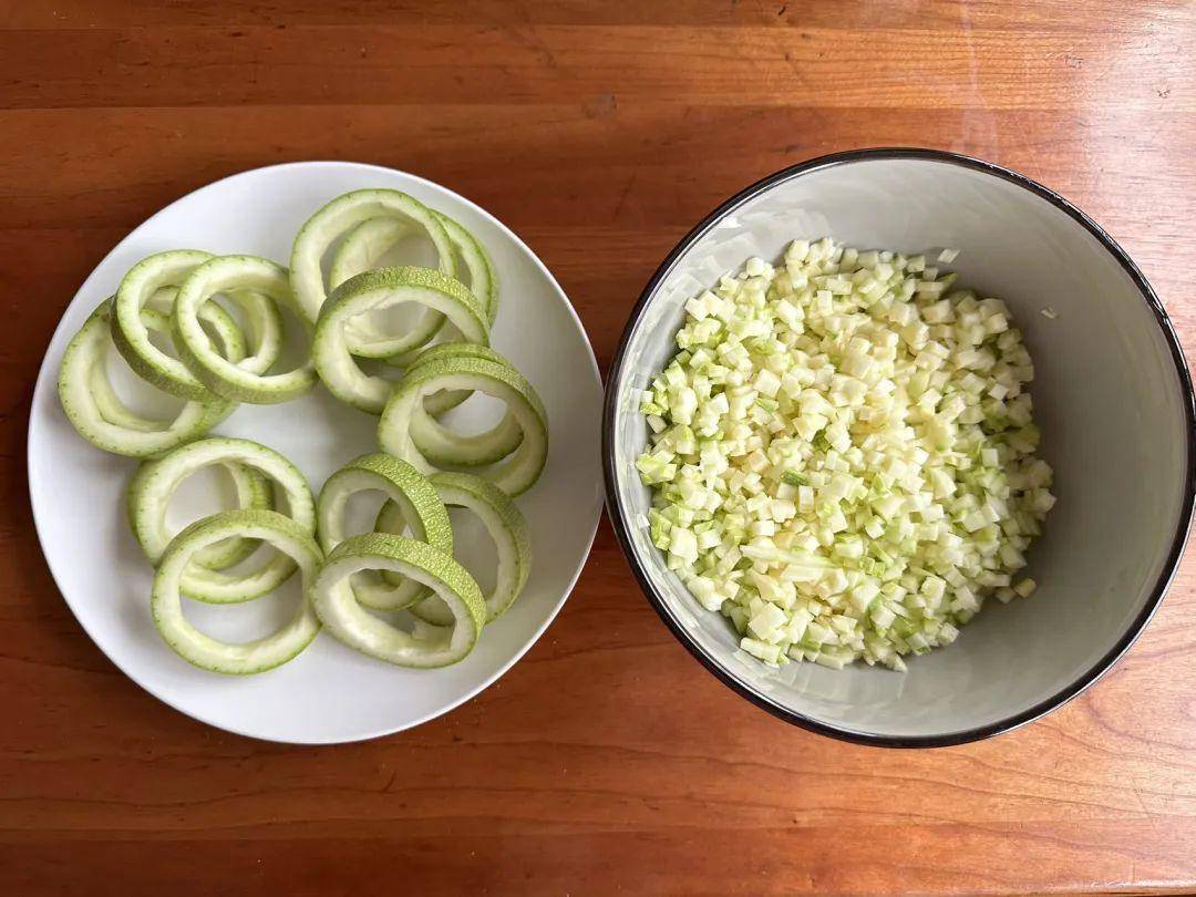 2、接下来,将西葫芦洗净后切成厚片。然后,我们需要用小刀轻轻地将西葫芦中间的部分挖出,这部分我们将其切碎备用。这样做不仅可以让西葫芦片成为可爱的圆圈形状,而且挖出的部分还能为后续的馅料增添风味。