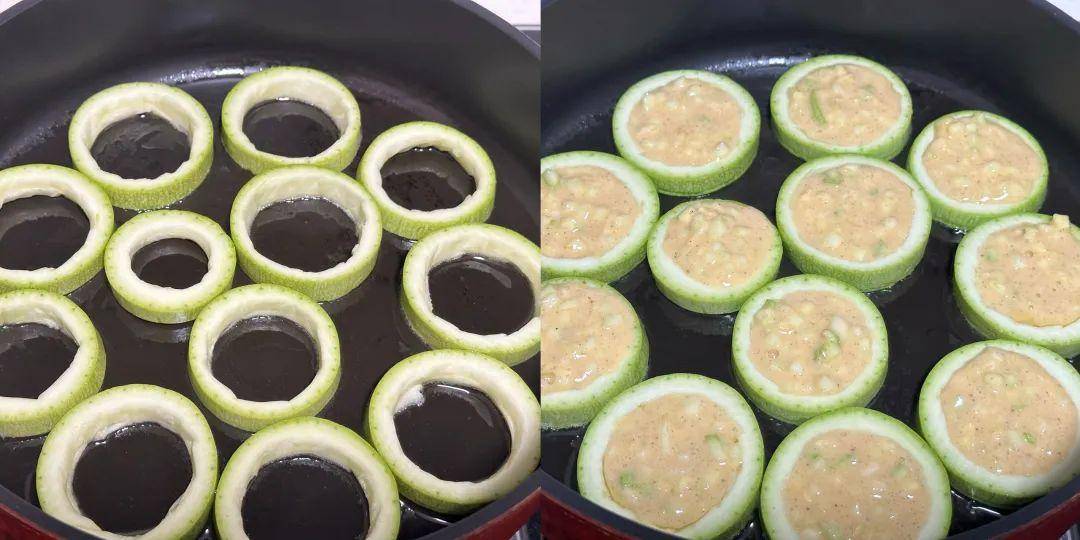 4、预热平底锅后,轻轻刷上一层油。然后,将西葫芦圈整齐地摆放在锅中。接着,将调制好的面糊均匀地放入每个西葫芦圈的中间,并用勺子轻轻整理平整,确保面糊能够充分填满圆圈。