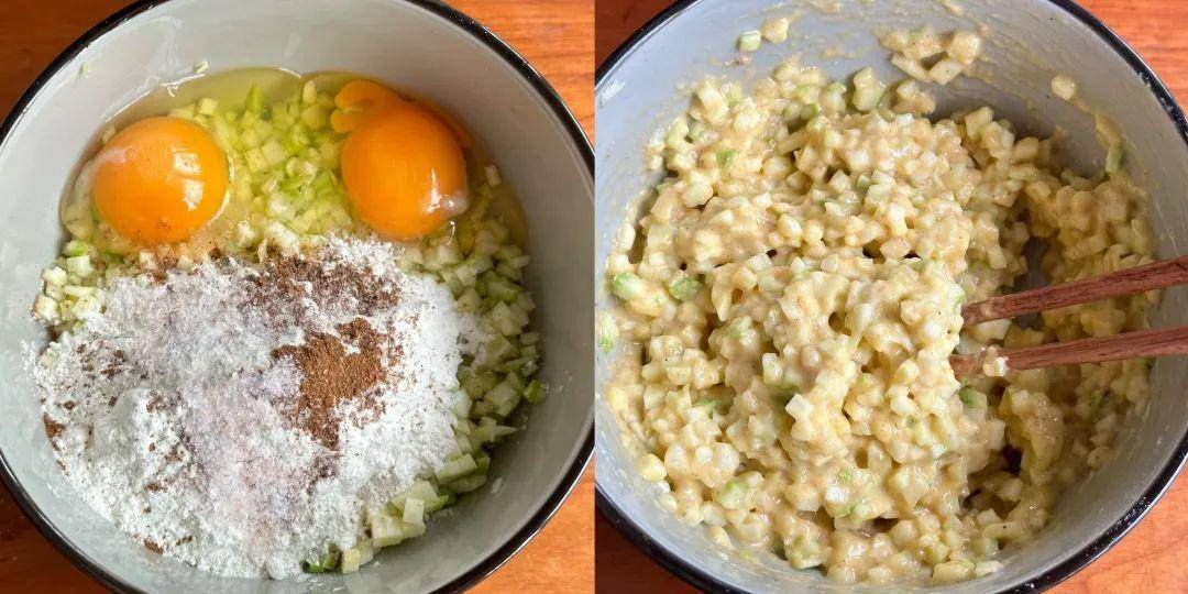 3、在切好的西葫芦碎中加入2个鸡蛋,再逐渐加入适量的面粉、盐和五香粉。搅拌时,要注意面糊的稠度,既不能过稀导致饼不成形,也不能过稠影响口感。最终,面糊应该呈现粘稠而均匀的状态。