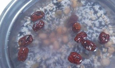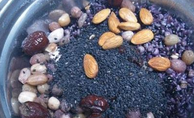 1、所有原料(除黑芝麻、巴旦木)头一天晚上清洗一下,用清水泡上(黑米、薏米质地比较硬,要提前泡;糯米的量不要加太多,不然太粘稠,糯米也可以换成大米)。